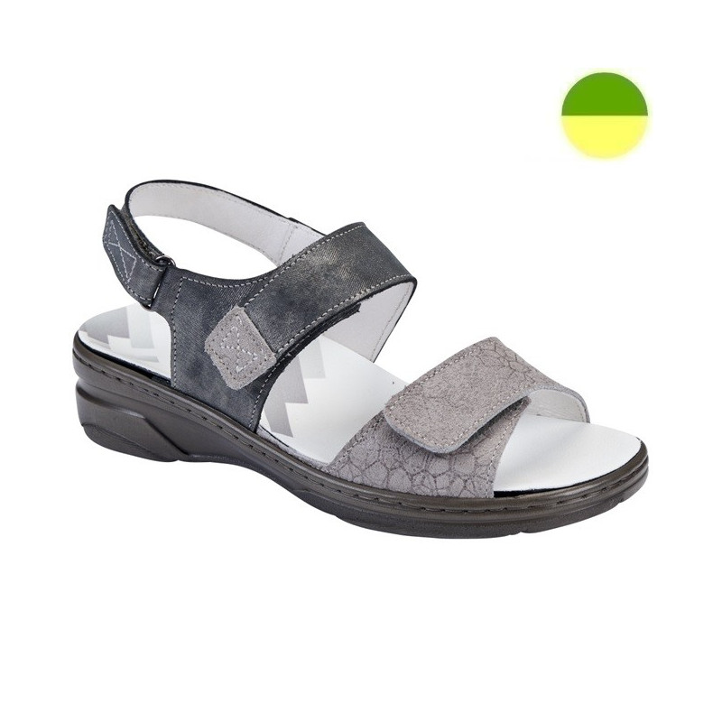 Sandale femme en cuir, réglage par bande auto-agrippante sur le cou et l'avant pied et système de va-et-vient sur le talon.