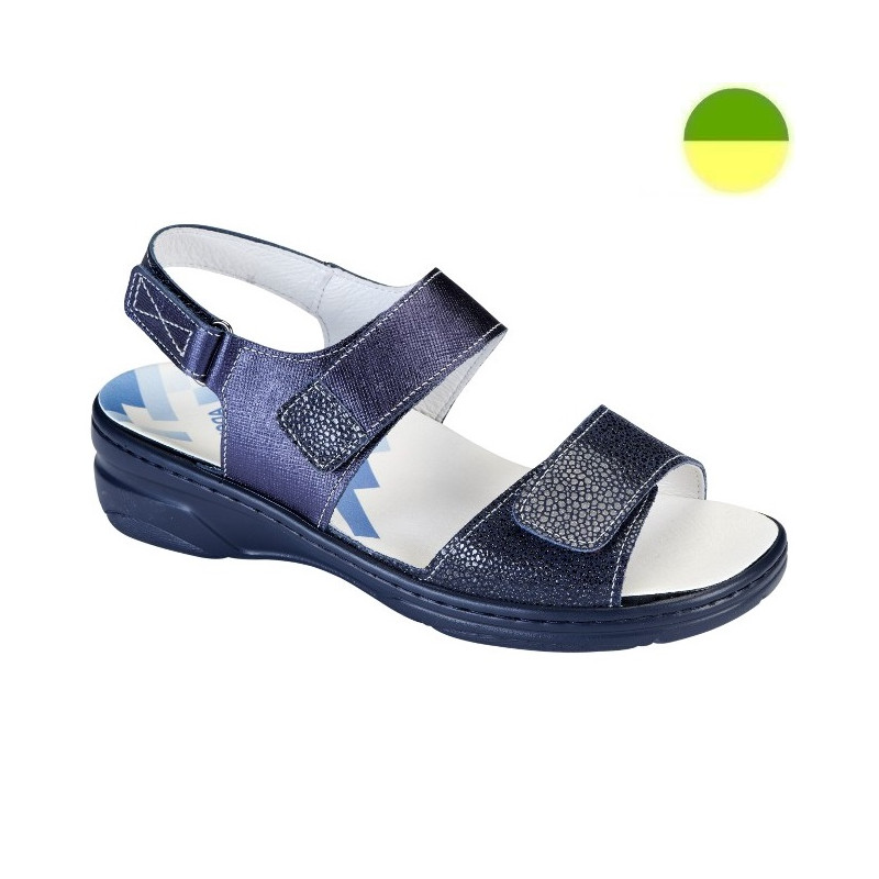 Sandale femme en cuir, réglage par bande auto-agrippante sur le cou et l'avant pied et système de va-et-vient sur le talon.