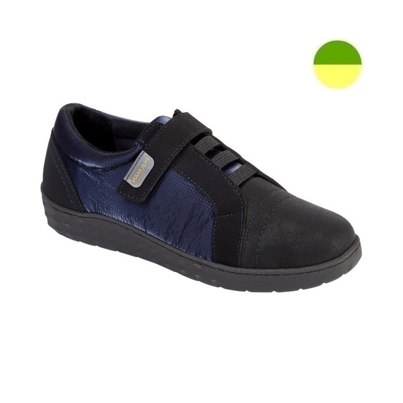 Chaussure femme à grande ouverture, extensible sur l'avant, réglage par élastique et bande auto-agrippante, semelle amovible.