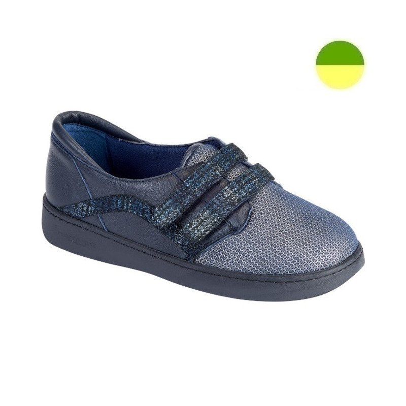 Chaussure femme, extensible à l'avant, à grande ouverture, réglage sur le coup de pied par double bandes agrippantes, bon maintien.