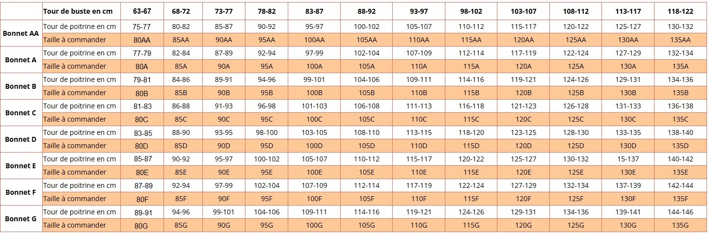 Si votre tour de buste (sous le sein) mesure 80 cm (il se situe entre 78 et 82 cm) votre taille sera 95 et ainsi de suite.