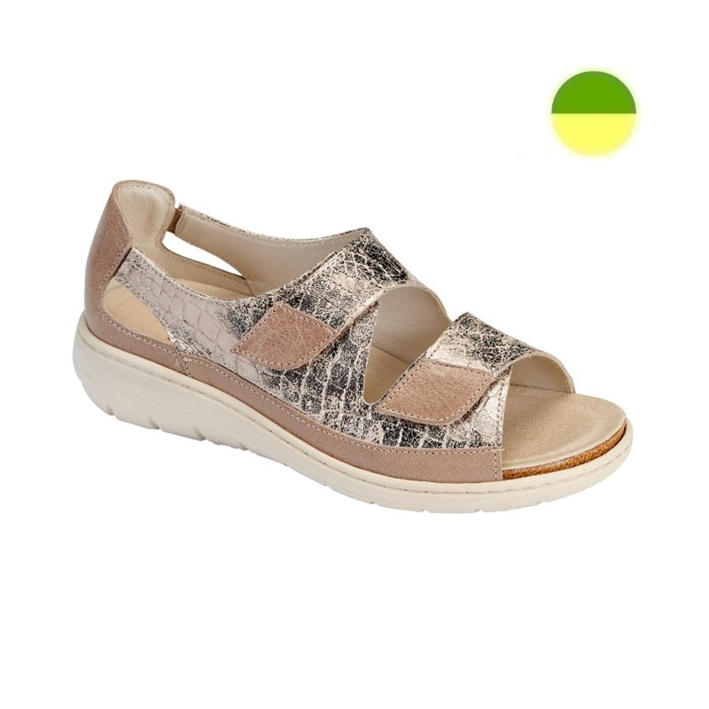 Sandale femme, à ouverture totale avec double réglages sur la cheville et l'avant pied, d'un très bon maintien, est équipé d'une semelle amovible.